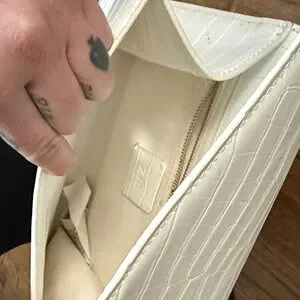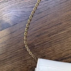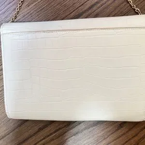 Stylish white croc-embossed crossbody with a gold chain strap. Sleek envelope flap design for a polished look. Lightweight and versatile for day-to-night wear. White color complements any outfit.