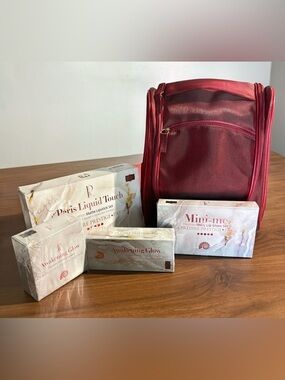 Paris liquid lip and gloss set in burgundy. Includes Paris Liquid Touch matte lipstick set, Mini-me shiny lip gloss set, Lip Balm, and Lip Oil set. Smooth, buildable color with a glossy finish. Packaged with a coordinating burgundy travel pouch by Avon for easy storage.