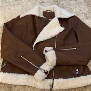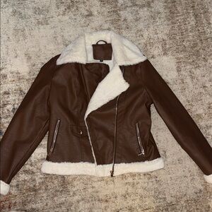 SHEIN Brown Faux Leather Jacket with Cream Sherpa Trim