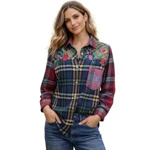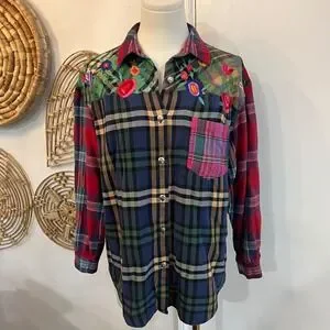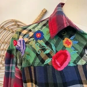 Keywords patchwork plaid shirt embroidered cotton button up boho western cottagecore folk floral statement top