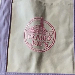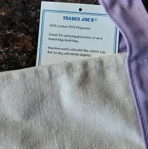Trader Joe's large canvas tote in cream with lavender accents. Durable fabric with reinforced lavender handles and base. Front pocket with Trader Joe's logo for easy access. Lightweight and stylish for everyday use. Smoke free and out free home.