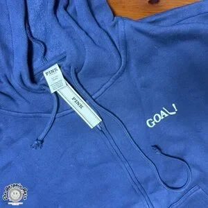 Rare early 2010s Victoria’s Secret PINK zip hoodie. New with tags, women’s small. Blue with hockey graphics — “GOAL!” on the front and “Hockey Is My Favorite Season” on the back. Limited seasonal sports line.