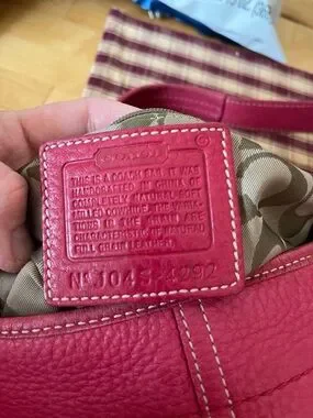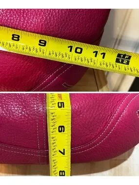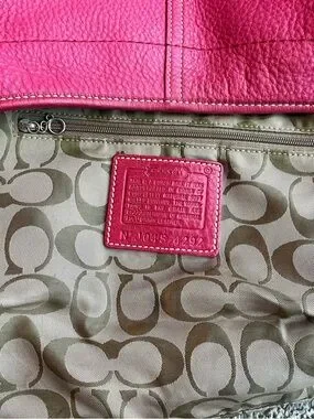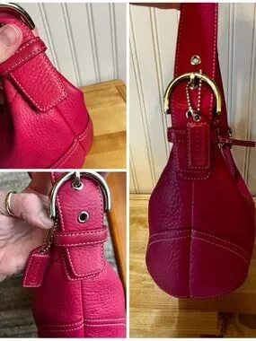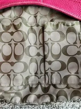 2004 Magenta Pink Coach Pebbled Leather Soho Hobo Bag. Inside is clean, no odors, no rips in lining. The overall outside leather is in very good condition. She is vintage so she isn’t pristine however she is in very nice condition. I showed her imperfections and honestly they show up more in the video and photos than when you see her in person! I tried to take a lot of photos so look carefully and ASK QUESTIONS BEFORE PURCHASING PLEASE!!! Her call outs are some faint discoloration on bottom and side ( again shown!! ) some slight fading of leather near top of zipper (shown). Hang tag is there, creed shown! She has been cleaned and conditioned.