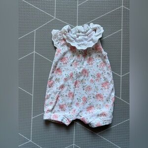 Soft floral romper with delicate lace collar. White base with pink rose print. Snap closures at legs for easy changes. Lightweight and cute for warm days.