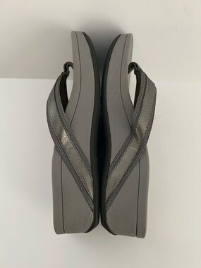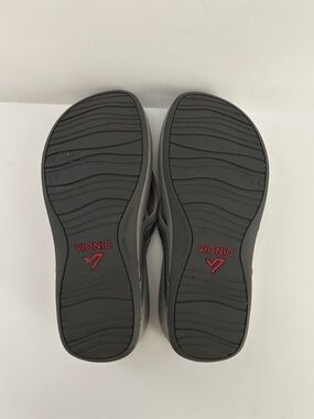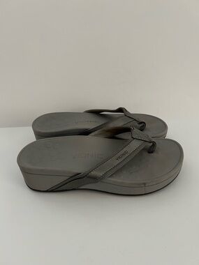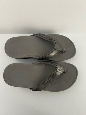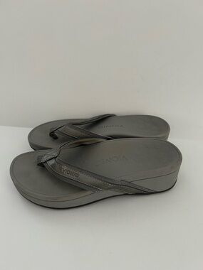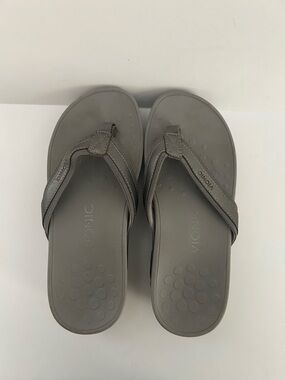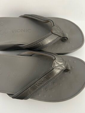 Vionic Hightide thong sandals in solid gray. Textured cushioned footbed for comfort. Easy slip-on design for daily wear.