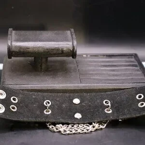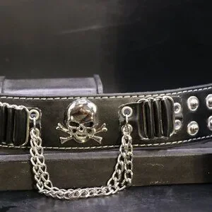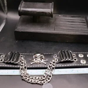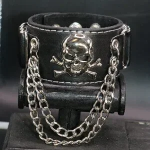 Black Leather Cuff Bracelet with Metallic Skull and Crossbones With Chains