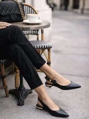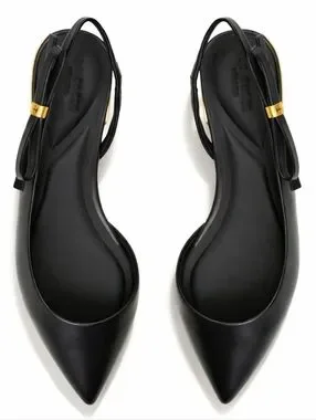 Ted Baker JANE Bow Slingback Flats Black Leather Pointed Toe Gold Detail Minimalist Chic