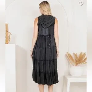Effortless sleeveless hooded midi dress in black. Lightweight tiered design offers breezy movement and textured detail. Easy pull-on style perfect for casual days or layered looks. Black color enhances versatile wear.