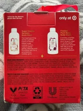 Dove Holiday Treats body wash set in white bottles. Gentle, nourishing cleansers with seasonal scents including Sugar Cookie Sprinkle and Frosted Plum Berry. Formulated to leave skin soft and lightly fragranced. Ideal for daily use and gifting during the holidays.