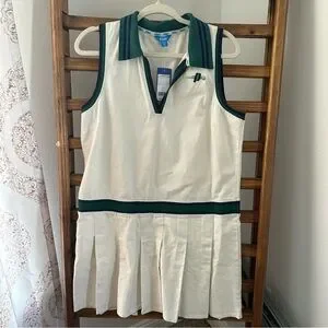 Prince sleeveless pickleball polo dress. White knit body with green and navy striped collar and waist trim. Zip V-neck and embroidered Prince logo at chest.