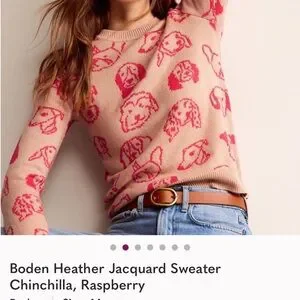 Boden crewneck sweater with playful dog motifs. Beige knit base with vibrant hot pink pattern. Soft, cozy texture. Classic neckline and ribbed trim.
