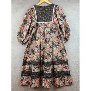 Vintage-inspired midi dress features a vibrant mixed floral and paisley print on a black ground. Designed with a square neckline accented by a lace-up front and delicate contrast trim, this piece showcases voluminous puff sleeves with elastic cuffs. The skirt is detailed with horizontal tiered panels of coordinating micro-floral patterns, creating a bohemian aesthetic. A back zipper closure ensures a secure fit, while the lightweight fabric provides a comfortable drape for all-day wear.