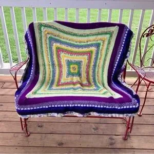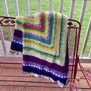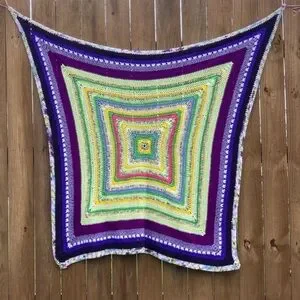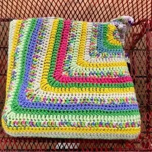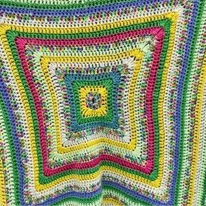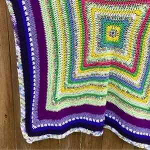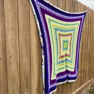 Small Handmade Crocheted Throw Blanket 54” x 52” Purple Green Yellow Pink