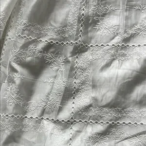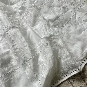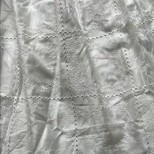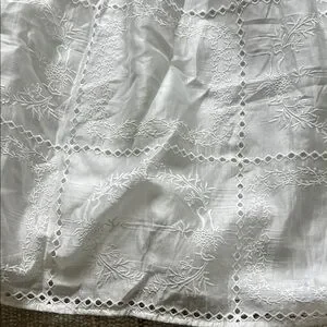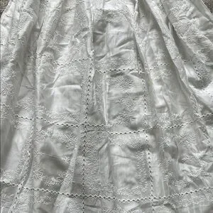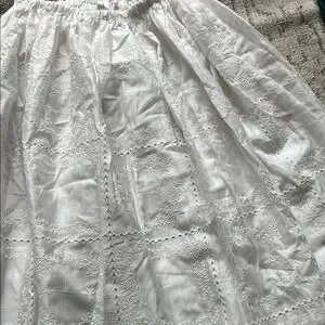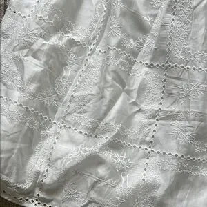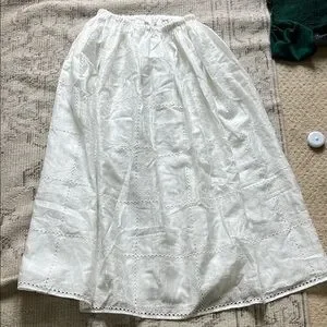 Crisp white A-line skirt with embroidered eyelet panels. Elastic waistband for easy wear. Soft cotton feel with feminine detailing. Pairs well with tees or blouses for a breezy look. Elastic waste measures about 13 1/4 inch across at rest and total length is about 36 inches. The hand work on the skirt is so Beautiful. It’s meant to be seen in person!