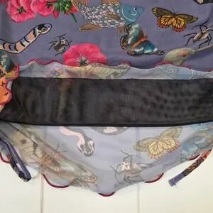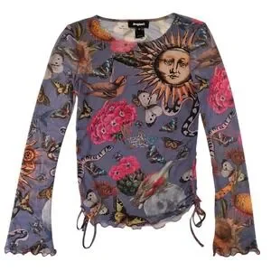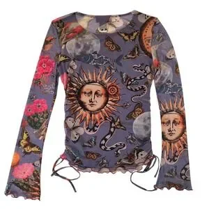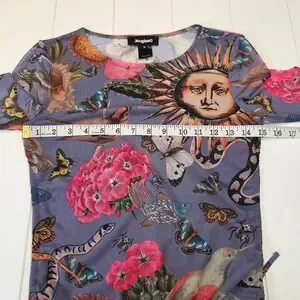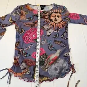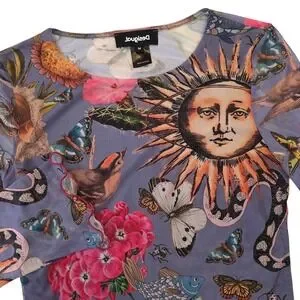 Embrace a whimsical, artistic energy with this stunning Desigual mesh top, featuring a vibrant celestial and nature-inspired print. The sheer, lightweight fabric is adorned with celestial suns, butterflies, birds, snakes,and botanical elements against a soft periwinkle backdrop, creating a truly unique wearable art piece. Designed with flattering side ruching and delicate lettuce-edge hems, this top offers a feminine silhouette that moves beautifully. This piece is in excellent pre-owned condition, showing no visible signs of wear. Perfect for a music festival, an art gallery opening, or a creative brunch date.