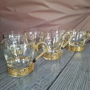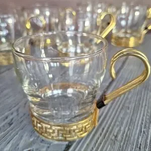 Vintage Libbey Glass "Greek Key" Continental Coffee Cup. These mid-century modern glasses are characterized by their clear glass construction and a removable gold-toned metal holder featuring a classic Greek key geometric pattern.