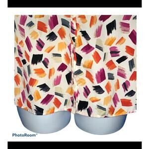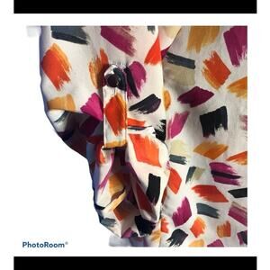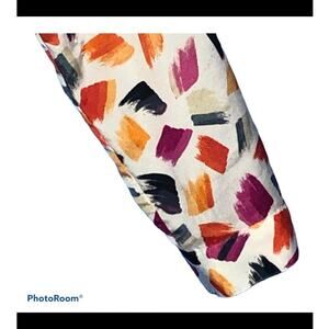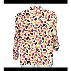 Anne Klein blouse, size Medium (label slightly faded; see measurements). White base with multicolor brushstroke print, featuring a mandarin collar and silver spike button closure. Silver buttons halfway down the front, hidden buttons for a half-button style. Flap & button sleeve detail allows rolling sleeves up or down. Made from 100% polyester, excellent pre-owned condition.