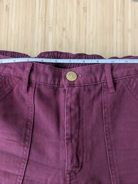 High-waist wide leg with front patch pockets. Deep berry color and durable cotton fabric. Button closure and belt loops. Simple, versatile silhouette. Great for casual styling.