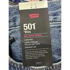 Levi's 501 '90s Selvedge Denim jeans offer a classic vintage-inspired silhouette with modern quality. These mid-rise jeans feature a loose fit through the hip and thigh, transitioning into a timeless straight leg. Crafted from premium selvedge denim, they showcase the iconic red-stitched woven fabric strip at the inner cuff, a hallmark of traditional narrow-width shuttle loom production. The medium blue wash is accented by authentic button-fly closure, copper-tone rivets, and the signature leather back patch.