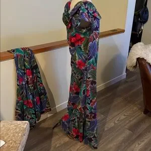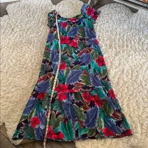 This is a vintage Hilo Hattie Original Hawaiian Muumuu full length dress in a tropical floral print with ruffle details