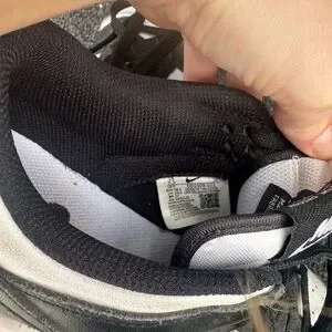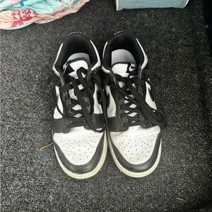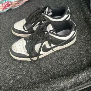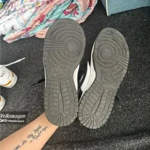 Low-profile Nike sneakers with black overlays and white panels. Leather and textile upper with signature swoosh. Lace-up closure for a secure fit. Padded collar for comfort. Versatile casual style.