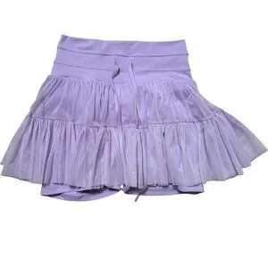 Lightweight ruffled mini skirt. Elastic waist with drawstring. Soft, sheer layered fabric. Flowy movement and playful silhouette.