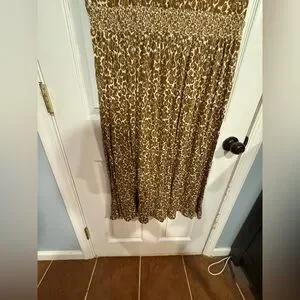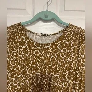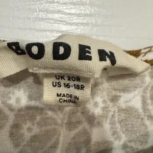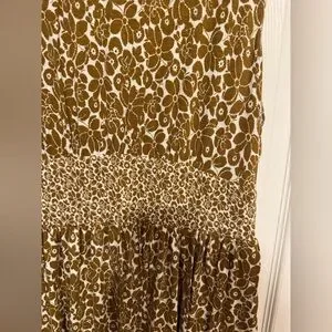 Sleeveless midi dress in brown floral pattern with round neckline and contrast waist detail. Size 16-18. Like new condition. Original price $120.