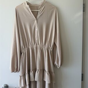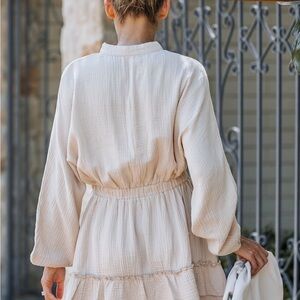 Cream mini dress with elastic waist and tiered ruffle skirt for a feminine shape. Button-front bodice and band collar create a clean, polished look. Long sleeves with gathered cuffs add subtle volume. Lightweight cream color pairs easily with sandals or heels for day-to-night wear.