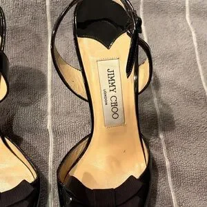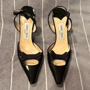 Jimmy Choo Black Patent Leather Pointed Toe slingback pump with bow accent