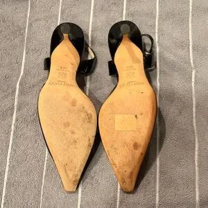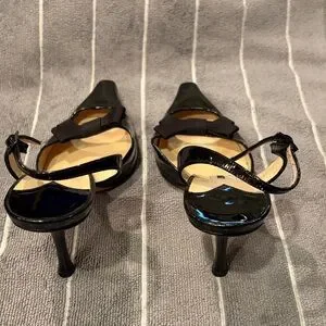 Elegant black patent leather pumps with pointed toe. Grosgrain bow detail at vamp. Slim ankle strap with buckle closure. Leather-lined insole for smooth wear. Classic evening silhouette. Very good condition.