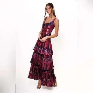Elegant tiered maxi dress in a burgundy and pink floral print. Scoop neckline and fitted bodice for a flattering silhouette. Lightweight layers create soft movement with every step. Perfect for special occasions or evening events.