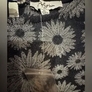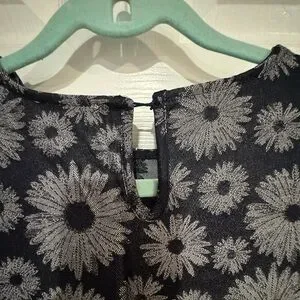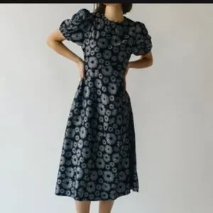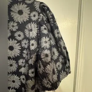Navy dress with sunflower design. Contrast stitch detailing and puff sleeve with elastic cuff. Size XL. New without tags but has packet with extra button attached. Original price $74.