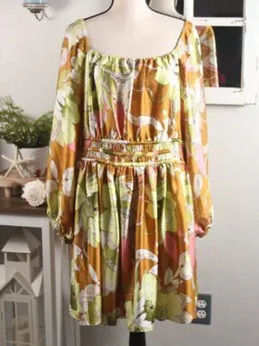 New With Tags Ryegrass floral mini dress in size XXL. This beautiful boho-inspired piece features a soft tan base with green, white, and pink floral print, a flattering smocked waist, and flowy long sleeves with elastic cuffs.