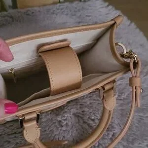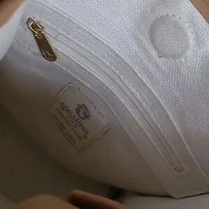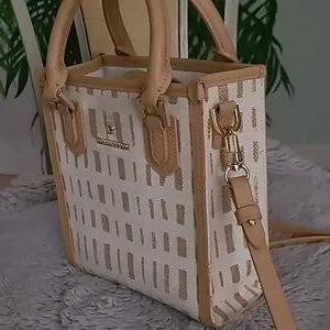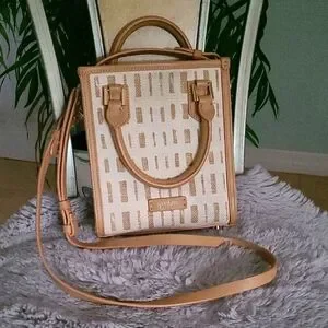Compact crossbody satchel by Spartina 449. Woven beige body with tan leather trim and handles. Removable adjustable strap for versatile wear. Gold-tone hardware and logo plaque. Structured silhouette with top handles for hand carry.
