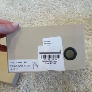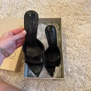 Sleek Tony Bianco black patent mule with a pointed toe. Smooth leather-like upper offers a polished look. Slip-on design for easy wear and effortless style. Worn once