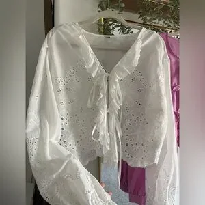 Cute tie-front top in pink and white. Lightweight fabric with eyelet lace and scalloped edges. Front tie closures for an adjustable fit. Pretty embroidered details add a feminine touch. Perfect for layering or wearing on its own.
