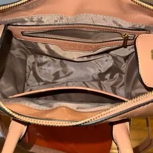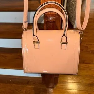 Stylish peach patent satchel with dual top handles and removable shoulder strap. Smooth glossy finish for a polished look. Gold-tone hardware accents add subtle shine. Lightweight and versatile for day-to-night wear.