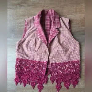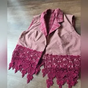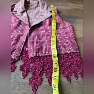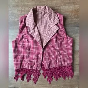 Vintage Hand Made Reversible Maroon Plaid Western Vest with Lace Fringe, size small. No major flaws noted, super cute! Please refer closely to photos for condition and measurements