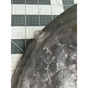 Vintage pewter wall hanging plate features an intricate embossed coat of arms design with a knight's helmet, shield, and ornate scrollwork. The rim is decorated with a deep gadroon or scalloped pattern, giving it a classic heraldic aesthetic. Crafted with a heavy, textured finish typical of pewter or cast aluminum, this decorative piece includes a built-in loop on the reverse for easy wall mounting. Perfect for adding a touch of medieval or gothic flair to a study, library, or gallery wall.