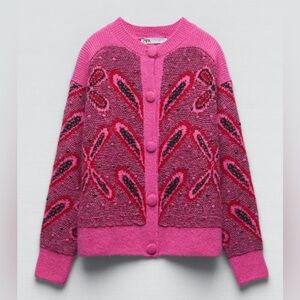 ZARA Pink Jacquard Knit Cardigan with Pompoms Size Large Bloggers Fave 5802/162