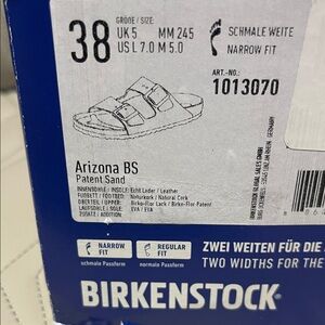 Two-strap Birkenstock slide with adjustable buckles. Patent sand upper with cork footbed. Classic contoured sole for support. Versatile neutral tone for everyday wear.