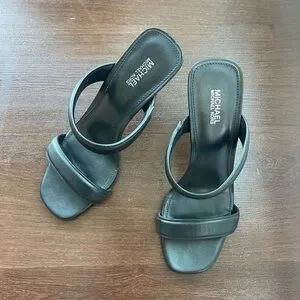 Very comfortable to wear. Chic black leather sandals by MICHAEL Kors. Square toe with two slim straps. Mid-height flared heels for stable lift. Smooth leather footbed with branded insole. Elegant and versatile for day or night.