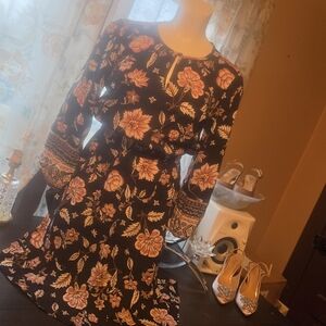 Old Navy long-sleeve maxi dress with an allover peach floral pattern. Elastic waist creates a relaxed, feminine shape. Lightweight fabric drapes softly for easy movement. Decorative cuff and neckline details add subtle interest.