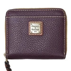Classic Dooney & Bourke zip-around wallet in a beautiful deep plum pebbled leather with contrast stitching and gold-tone hardware. Features multiple card slots, bill compartments, and a secure zip coin pocket with a bold red interior for a pop of color.