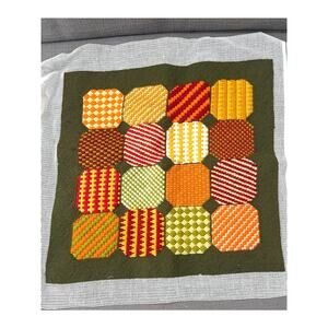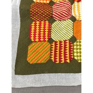 Vintage handmade textile panel featuring embroidered needlepoint, colorful geometric motifs, and a rich cottagecore folk art aesthetic. This piece showcases bold retro colorwork with repeating patterned shapes stitched on a deep green background, framed by original mesh canvas edges. A wonderful example of mid-century textile art, perfect for wall display, framing, pillow making, upholstery accents, or creative DIY sewing and craft projects. Measures approximately 28 x 21 inches. Ideal for collectors of vintage needlepoint, boho decor, or handcrafted fiber art.