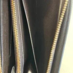 Dark brown cross-grain leather interior with card slots, patch pockets, and a zipper compartment.