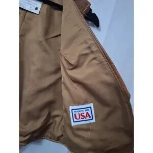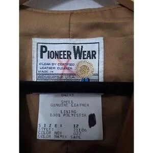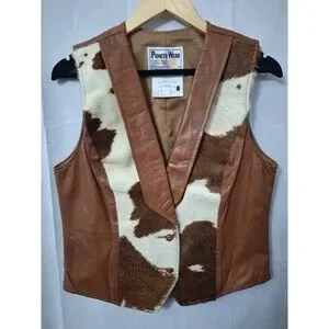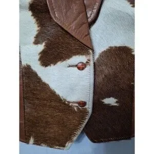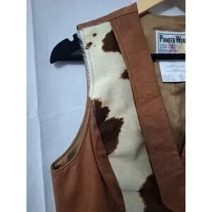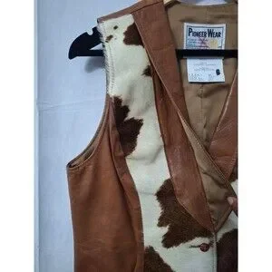 The Vintage Pioneer Wear Cowhide Leather Cow Print Vest for women in size 12 features a stylish cow print pattern, perfect for a Western cowgirl theme. This sleeveless vest with a button closure is made in the USA of genuine cowhide leather with a soft polyester lining, making it a versatile piece for various occasions such as casual outings, parties, or workwear. With a vintage brand like Pioneer Wear, this regular fit vest also includes inner pockets, is lightweight, and breathable, making it suitable for all seasons and adding a touch of personality to any outfit. Has a few light spots on the back. SEE PHOTOS!!! PTP 17.5 in. Length 22 in.