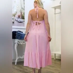 The Reagen is a dramatic, midi length halter dress made from Xirena's iconic Chelsea Gauze. This dress features self ties at the neck and back straps, a tiered skirt and side seam pockets!