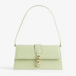 Compact pastel green shoulder bag with a structured rectangular shape. Single top strap for easy carry. Gold-tone clasp and hardware accent the front. Smooth finish with neat stitching detail. Modern and versatile accessory for everyday wear.