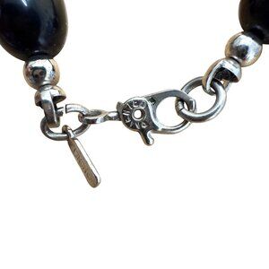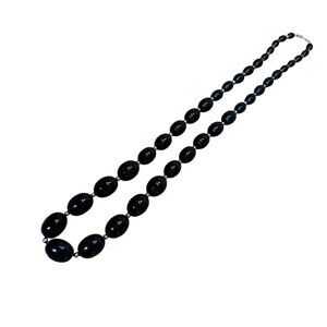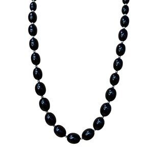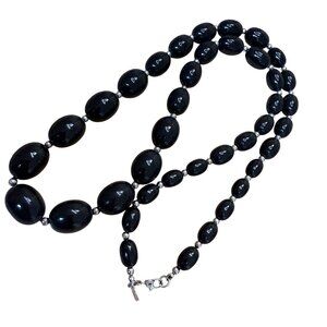 This striking vintage necklace captures elegance with its glossy black beads and subtle silver accents. flatters any neckline, clasped securely with a classic lobster closure. A versatile accessory, it transitions seamlessly from daytime sophistication to evening allure, embodying timeless style for the discerning wearer.